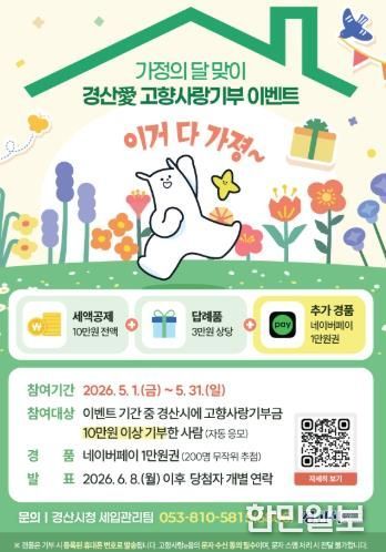 한민일보 서울포커스 임경복 기자 | 경산시는 5월 가정의 달을 맞아 ‘경산愛 고향사랑기부 이벤트’를 5월 1일부터 31일까지 한 달간 실시한다.