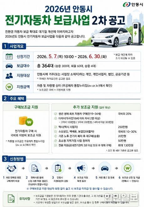 한민일보 서울포커스 김봉순 기자 | 안동시는 최근 지속되는 고유가 현상에 선제적으로 대응하고 시민의 전기자동차 구매 수요를 충족하고자, 당초 7월로 예정됐던 2차 보급 사업을 5월로 앞당겨 추진한다고 4월 30일 밝혔다. 시는 이번 조기 시행을 통해 친환경 무공해 자동차 보급을 가속화하고 시민들의 경제적 부담을 완화할 방침이다.