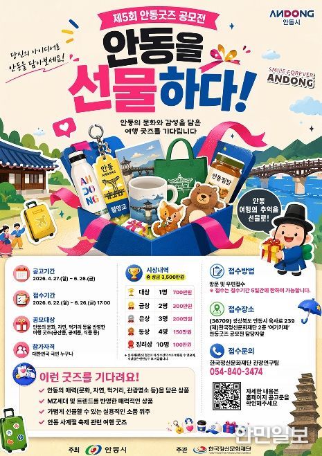 한민일보 서울포커스 김봉순 기자 | 안동시와 (재)한국정신문화재단은 관광거점도시 안동의 지역 브랜드 가치를 높이고 경쟁력 있는 관광 상품을 발굴하기 위해 『제5회 안동을 선물하다! 안동굿즈 공모전』을 개최한다고 밝혔다.