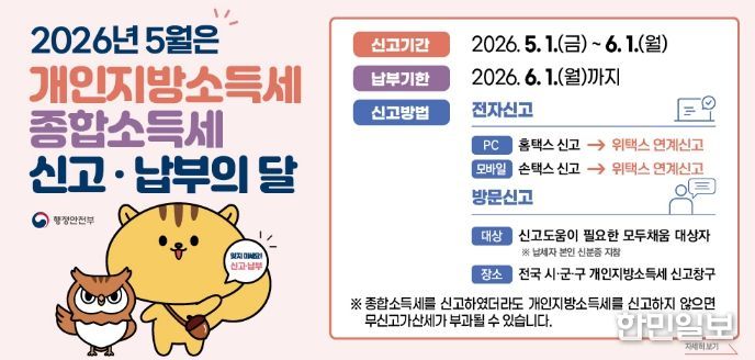 종합소득세는 2025년에 발생한 사업소득, 근로소득, 이자·배당소득, 연금소득, 기타소득 등을 합산해 신고하는 세금이다. 개인지방소득세는 종합소득세의 10%에 해당하는 지방세로, 종합소득세 신고와 함께 5월 1일부터 6월 1일까지 신고·납부해야 한다.