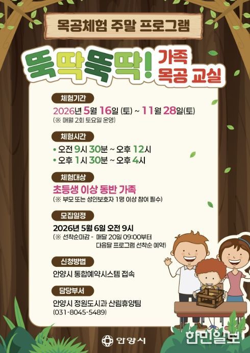 한민일보 서울포커스 김성윤 기자 | 안양시는 초등학생과 가족이 함께 참여할 수 있는 목공체험 주말 프로그램인 ‘뚝딱뚝딱! 가족 목공 교실’을 운영한다고 30일 밝혔다.