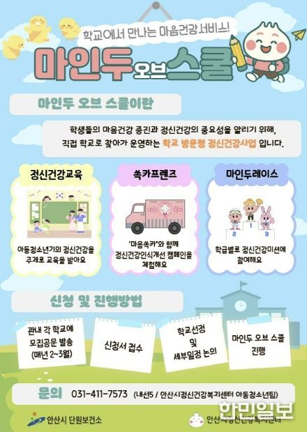 한민일보 서울포커스 임철현 기자 | 안산시 정신건강복지센터는 11월까지 관내 초·중·고등학교 총 10개교를 대상으로 학교로 찾아가는 정신건강사업 ‘마인두 오브 스쿨’을 운영한다고 30일 밝혔다.