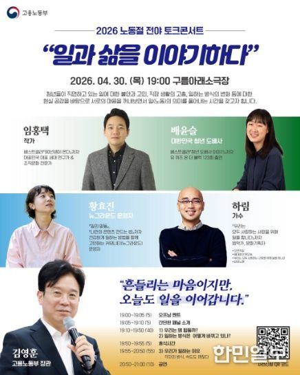 한민일보 서울포커스 임경복 기자 | 고용노동부는 4월 30일 저녁 7시, 서울 마포구 소재 ‘구름아래소극장’에서 청년 200여 명과 함께 일에 대한 고민을 나누며, 노동의 가치를 다시 한번 생각해 보는'일과 삶을 이야기하다' 토크콘서트를 개최했다고 밝혔다.