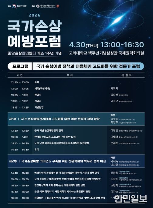 한민일보 서울포커스 임경복 기자 | 질병관리청은 중앙손상관리센터 개소 1주년을 맞아 4월 30일 고려대학교 백주년기념삼성관에서 「2026년 국가손상예방포럼」을 개최한다.