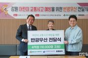 한민일보 서울포커스 곽중희 기자 | 강원특별자치도교육청은 9월 11일 오전 11시, 본청 접견실에서 DB김준기문화재단, DB손해보험, 한문철TV와 함께 ‘강원 어린이 교통사고 예방을 위한 반광우산 전달식’을 개최했다. 이번 전달식은 DB김준기문화재단의 사회공헌 활동의 일환으로 마련됐으며, 강원특별자치도 내 초등학교 1학년 학생들을 대상으로 총 1만 개의 반광우산을 지원한다. 반광우산은 야간이나 우천 시 운전자의 시야 확보를 도와 교통사고 위험을 줄일 수 있도록 제작된 안전용품으로, 학생들의 안전한 통학에 크게 기여할 것으로 기대된다. 전달식에는 신경호 교육감을 비롯하여 DB김준기문화재단 강은정 이사, DB손해보험 심재철 부문장, 한문철TV 한문철 변호사 등이 참석하여 교육청·기업·민간이 함께하는 교통안전 협력체계를 확인하는 자리가 됐다. DB김준기문화재단 관계자는 “작은 우산 하나가 아이들의 생명을 지킬 수 있다는 생각으로 이번 캠페인을 기획했다”며, “앞으로도 어린이 교통안전을 위한 사회공헌 활동을 지속해 나가겠다”고 밝혔다. 신경호 교육감은 “이번 반광우산 지원은 학생들의 안전한