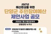 한민일보 서울포커스 김다남 기자 | 단양군은 군민이 예산편성 과정에 직접 참여해 지역에 꼭 필요한 사업을 제안할 수 있도록 ‘2027년 예산편성을 위한 주민참여예산 제안사업 공모’를 실시한다고 밝혔다. 이번 공모는 오는 7월 31일까지 진행되며, 단양군민은 물론 단양군 소재 직장·단체·학교에 소속된 사람이면 누구나 참여할 수 있다. 참여를 희망하는 주민은 주민e참여 홈페이지를 통해 온라인으로 접수하거나, 우편 또는 단양군청 예산팀, 가까운 읍·면사무소를 방문해 제안서를 제출하면 된다. 제안 대상은 단양군에 꼭 필요한 주민 체감형 사업 전반이다. 특히 재해·재난 및 각종 안전사고 예방과 관련된 사업은 우선 검토 대상으로 반영해 군민 안전과 직결되는 사업이 적극 추진될 수 있도록 할 계획이다. 다만 ▲국가사무 ▲사전절차 이행이 필요한 대규모 투자사업 ▲이미 시행 중이거나 유사·중복되는 사업 ▲민간보조사업 ▲특정 단체·지역·개인을 위한 사업 ▲연례적·반복적인 필수경비 및 일회성 행사 ▲소규모 주민숙원사업 등은 공모 대상에서 제외된다. 이번 공모는 군민의 다양한 의견을 군정에 반영