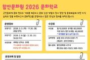 한민일보 서울포커스 김서윤 기자 | 함안문화원은 군민들에게 문화 향유 기회 제공하고, 문화 심성 계발과 정서 함양 및 문화예술에 대한 지식 습득의 장을 마련하고자 2026년 문화학교 수강생을 2월 9일부터 25일까지 선착순으로 모집한다고 밝혔다. 운영과목은 함안화천농악, 통기타, 색소폰, 플루트, 생활한자, 노래교실, 경기민요, 난타, 트롯댄스, 가야금, 서예, 시조창·가곡으로 총 12과목이다. 운영 기간은 3월 3일부터 11월 30까지(8월방학, 8개월간)이며, 수강료는 월 1만원으로, 함안문화원 회원은 50% 할인된다. 기타 상세한 내용은 함안문화원 누리집 공지사항을 참고 하거나 함안문화원 사무국으로 문의하면 된다.
