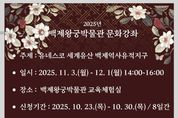 한민일보 서울포커스 김용택 기자 | 익산시가 세계유산 등재 10주년을 맞아 '유네스코 세계유산 백제역사유적지구'의 가치와 의미를 시민들과 공유한다. 익산시는 백제왕궁박물관에서 오는 11월 3일부터 12월 1일까지 월요일 오후 2시에 문화강좌를 운영한다고 23일 밝혔다. 이번 강좌는 백제왕궁박물관에서 진행되는 '세계유산 등재 10주년 특별전'과 연계한 교육 프로그램이다. 백제의 찬란한 역사와 세계유산의 보존 가치를 주제로 총 4회에 걸쳐 운영된다. 강좌는 △11월 3일 '세계유산의 중요성'(김낙중, 전북대학교) △11월 10일 '세계유산 백제역사유적지구-부여를 중심으로'(전용호, 국가유산청) △11월 24일 '세계유산 백제역사유적지구-익산을 중심으로'(문이화, 원광대학교 마한·백제문화연구소) △12월 1일 '세계유산 백제역사유적지구-공주를 중심으로'(최경환, 국립공주박물관)로 구성됐다. 강좌 참가 희망자는 오는 30일까지 백제왕궁박물관 누리집 교육프로그램을 통해 신청할 수 있으며, 당일 현장 접수도 가능하다. 더욱 자세한 내용은 백제왕궁박물관으로 문의하면 된다.