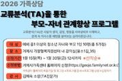 한민일보 서울포커스 김은금 기자 | 거제시가족센터는 오는 2일부터 진행하는'교류분석(TA)을 통한 부모–자녀 집단상담 프로그램' 참여자를 모집한다고 밝혔다. 프로그램 주요 내용은 자아상태검사, 부모-자녀 간 의사소통 패턴 이해하기, 갈등 상황에서 안정적인 대화법 등으로 청소년의 마음 성장과 가족관계 회복을 지원하는 데 목적이 있다. 모집 대상은 예비 중학생 이상의 청소년 자녀와 양육자 5가정이며, 거제시가족센터 홈페이지를 통해 신청‧접수 가능하다. 자세한 문의는 거제시가족센터로 하면 된다. 류주진 센터장은 “방학은 가족이 서로를 이해하고 관계를 돌아볼 수 있는 좋은 시기”라며 “부모와 아이가 한 걸음 더 가까워지는 시간이 되길 바란다”고 밝혔다.