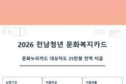 한민일보 서울포커스 박정민 기자 | 전라남도는 2026년부터 전남 청년 문화복지카드 사업 추진 시 경제적 취약 계층(기초생활수급자·차상위계층)이 수혜를 받는 문화누리카드 지급자에게도 25만 원 전액을 지급한다고 밝혔다. 전남청년 문화복지카드는 청년의 문화 향유 기회를 넓히고 자기 계발을 돕기 위해 2022년부터 시행하고 있다. 전국 최초로 소득 기준 없이 청년에게 문화복지비를 10년간 최대 250만 원을 지원한다. 이를 통해 청년은 공연 관람, 학원 수강, 도서 구입, 체육시설 이용 등 다양한 문화·복지 혜택을 받을 수 있다. 기존 전남청년 문화복지카드는 전남에서 2년 이상 주소를 두고 거주한 19세 이상 28세 이하 청년에게, 1인당 연 25만 원을 지원했지만, 문화누리카드 수혜를 받는 신청자에 한해서는 문화누리카드 수혜액을 차감한 금액만 지급했다. 전남도는 취약계층 청년의 실질 지원액이 줄어 형평성 문제를 해결하기 위해 보건복지부 사회보장협의 개선 건의를 통해 복지 불균형을 해소하고 청년의 문화향유권을 보장하기 위해 제도 개선을 추진했다. 이후 1년여 노력 끝에 결실을