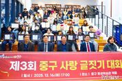 한민일보 서울포커스 백진욱 기자 | 인천 중구의회는 12월 16일, 중구 평생학습관에서 개최된 제3회 중구사랑 글짓기 대회 시상식에 참석해 수상자들을 축하했다고 밝혔다. 이날 시상식에는 강후공 의원이 참석해 수상자들에게 축하 인사를 전하고, 참여 학생들과 관계자들을 격려했다. 강후공 의원은 “이번 대회를 통해 지역에 대한 이해와 자긍심이 자연스럽게 형성되고, 올바른 가치관과 표현력을 기르는 계기가 되길 바란다”라며 “중구의회도 지역 정체성과 공동체 의식을 높이는 다양한 문화·교육 활동을 지속적으로 응원하겠다”라고 밝혔다. 또한 앞으로도 주민 참여형 문화·교육 행사를 적극 지원하고, 지역사회와 소통하는 의정활동을 이어갈 계획이라고 말했다.