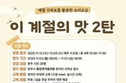 한민일보 서울포커스 임경복 기자 | 원주시 동부복합생활지원센터는 오는 11월 3일부터 ‘이 계절의 맛 2탄’ 건강 요리 교실 프로그램 참여자를 모집한다. 이번 프로그램은 제철 식재료를 활용해 면역력과 활력을 높이는 건강 요리 실습을 통해 지역 주민들의 건강하고 균형 잡힌 식습관 형성을 돕는다. 교육은 11월 12일부터 12월 3일까지 매주 수요일마다 총 4회에 걸쳐 영양교육 및 요리 실습이 열린다. 프로그램은 오전 10시 30분부터 11시 30분까지 한 시간 동안 진행된다. 모집 인원은 20명이며, 11월 3일 오전 9시부터 11월 7일(금)까지 선착순 모집한다.