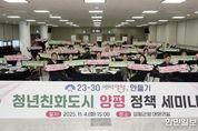 한민일보 서울포커스 차재만 기자 | 양평군은 지난 4일 오후 3시 양평군청 대회의실에서 ‘청년친화도시 조성을 위한 미래 방향성과 차별화 전략’을 주제로 ‘23-30 매력 양평 만들기’ 정책세미나를 개최했다. 이번 세미나는 청년이 머물고 싶은 도시, 청년이 주도적으로 참여할 수 있는 ‘매력양평’ 구현을 위한 실질적인 정책 방향을 논의하고자 마련됐다. 이날 행사에는 전진선 양평군수를 비롯해 양평군의회, 양평군 정책자문단, 청년정책위원회, 청년단체 등 관계자 100여 명이 참석했다. 1부에서는 인사말씀과 축사, 기념촬영이 진행됐으며, 2부에서는 손신 교수(아신대학교, 양평군 정책자문단 위원)의 ‘청년친화도시 조성을 위한 미래 방향성 및 차별화 전략’과 길청순 이사장(지역농업네트워크 서울경기제주협동조합, 양평군 정책자문단 위원)의 ‘농업·농촌의 미래와 청년농업인’ 발제가 이어졌다. 전진선 양평군수는 “청년이 머물고 싶은 도시, 청년이 주도적으로 참여할 수 있는 ‘매력양평’을 만들기 위해 행정과 지역사회가 함께 힘을 모아야 한다”며 “오늘 세미나에서 제시된 다양한 의견을 향후 청년정책에 적극 반영하겠다”고 밝혔다. &n