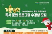 한민일보 서울포커스 임광현 기자 | 여수시가 운영하는 5개 공립 작은도서관에서 오는 2026년 1월 5일부터 8일까지 ‘겨울방학 독서문화 프로그램’ 수강생 106명을 선착순 모집한다. 이번 프로그램은 방학을 맞아 학생과 성인을 대상으로 독서를 통해 창의력·사고력을 증진하기 위한 다양한 독서문화 프로그램으로 마련됐다. 운영 기간은 오는 2026년 1월 12일부터 2월 24일까지며 프로그램별 기간이 다르다. 운영 작은도서관은 ▲여문늘벗(구 중부보건지소) ▲꿈을키우는(미평 선경 3차 아파트) ▲화양열린(화양면민회관 2층) ▲청솔글누리(돌산 청솔 2차 아파트) ▲국동(국동 임시별관 1층) 등 5곳이다. 운영 프로그램은 ▲여문늘벗 ‘독서와 보드게임으로 즐기는 세계사(1.16.~2.20.)’ ▲꿈을키우는 ‘하루 한 줄, 그림책 필사(1.12.~1.16.)’, ‘그림책 속 색깔 마법(1.19.~1.23.)’ ▲화양열린 ‘마음보석이 빛나는 그림책 이야기’(1.14.~1.30.), ‘책톡! 영상톡! 나만의 책을 영상으로 표현하기(1.13.~1.29.)’ ▲청솔글누리 ‘책이 들려주는 그림소리(1.13.~2.24.)’, ‘책과 함