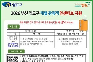 한민일보 서울포커스 임광현 기자 | 부산광역시 영도구는 관광객 유입 확대와 체류형 관광 활성화를 위해 '2026년 관광객 유치 여행사 인센티브 지원 사업'을 추진한다고 밝혔다. 이번 사업은 관광진흥법에 따라 적법하게 등록된 전국 여행사를 대상으로 하며, 단체 관광객을 영도로 유치할 경우 관광객 유형(내·외국인)과 체류 형태(당일·숙박)에 따라 1인당 최소 5천 원에서 최대 3만 원까지 인센티브를 차등 지원한다. 지원 기간은 2026년 1월 5일부터 12월 15일까지이며, 예산 소진 시 조기 종료된다. 특히 2026년에는 숙박(1박) 관광에 대한 지원 조건을 완화하고, 관내 관광지·식당·카페·숙박시설 이용을 연계해 체류형 관광 확대와 지역 내 소비 촉진에 중점을 두었다. 영도구 관계자는 “이번 인센티브 지원 사업을 통해 단체 관광객 유치를 확대하고, 관광 소비가 지역경제로 이어지는 선순환 구조를 강화할 계획”이라며, “전국 여행사의 적극적인 관심과 참여를 기대한다”고 말했다. 사업과 관련한 자세한 사항은 영도구청 홈페이지 공고문을 참고하거나 문화관광과 관광진흥팀으로 문의하면 된다.