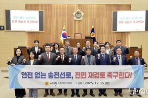 한민일보 서울포커스 임경복 기자 | 세종특별자치시의회 임채성 의장은 15일 초고압 송전선로 건설사업을 반대하는 장군면 주민들을 만나 현장의 의견을 청취했다. 이날 간담회에는 ‘세종시 송전선로 경유 결사반대 장군면 대책위원회’ 관계자들과 안신일, 김효숙, 박란희, 여미전, 이순열 의원이 함께 참석했다. 대책위원회는 초고압 송전선로 건설로 인한 전자파 위험과 생활환경 훼손, 재산권 침해 등 다양한 문제점을 지적하며, 의회의 적극적인 대응을 요청했다. 특히 ▲ 건설사업 전면 백지화 ▲ TF 구성 등 세종시 차원의 강력한 대응을 요구했다. 임채성 의장은 “초고압 송전선로는 전자파로 인한 건강 우려는 물론 생활환경 악화와 재산권 침해 등 주민의 안전과 삶 전반에 심각한 영향을 미칠 수 있는 사안”이라며 “현장의 절박한 목소리를 결코 외면하지 않고, 시민의 안전과 권리를 지키기 위해 끝까지 함께하겠다”고 강조했다. 한편, 세종시의회는 제102회 정례회 본회의 마지막 날인 이날, 안신일 의원의 ‘행정수도를 관통하는 345kV 송전선로 건설계획 즉각 철회 촉구’ 5분 자유발언에 이어, ‘신계룡–북천안