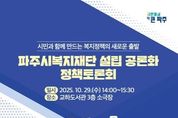 한민일보 서울포커스 진광성 기자 | 파주시는 오는 29일 14시, 교하도서관 3층 소극장에서 ‘파주시복지재단 설립 공론화 정책토론회’를 개최한다고 밝혔다. 이번 토론회는 파주시복지재단 설립을 앞두고 시민, 전문가, 현장 종사자의 다양한 의견을 수렴해 재단 설립의 필요성과 발전 방향을 함께 모색하기 위해 마련됐다. 토론회는 김민철 서영대학교 사회복지행정학과 교수의 기조 강연을 시작으로, 파주시 복지기획팀장의 주제 발표가 이어진다. 이어 한지원 두원공과대학교 교수가 좌장을 맡아 토론을 진행하며, 이보경 파주시문산종합사회복지관 관장, 오민수 경기복지재단 선임연구위원, 박윤근 화성시복지재단 사업본부장 등이 참석해 열띤 논의를 펼칠 예정이다. 토론에서는 ▲파주시복지재단 설립의 필요성과 추진 개요 ▲파주시 여건을 반영한 복지재단의 발전 방향 ▲재정 자립 및 지속가능성 확보 방안 등 다양한 주제가 심도 있게 논의될 예정이다. 김은숙 복지정책국장은 “파주시복지재단은 시민의 삶을 보다 세밀하게 지원하고, 지역 현장의 목소리를 반영한 ‘파주형 복지모델’을 실행할 구심점이 될 것”이라며, “이번 토론회를 통해 파주시
