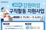 한민일보 서울포커스 임경복 기자 | 속초시와 속초여성새로일하기센터가 속초시에 거주하는 40세 이상 59세 이하 미취업 여성을 대상으로 ‘2026년 강원여성 구직활동 지원사업’ 참여자를 모집한다. 강원여성 구직활동 지원사업은 취업을 준비하는 여성에게 구직활동에 필요한 비용을 지원해 경제활동 재진입을 돕는 사업이다. 신규 참여자에게는 최대 300만 원, 재참여자에게는 최대 150만 원의 구직활동지원금을 지원한다. 지원 기간 중 취·창업에 성공해 3개월 이상 근속하면 50만 원의 취·창업 성공금도 지급한다. 신청 기간은 2월 11일부터 3월 4일까지다. 지원 대상은 모집 시작일인 2월 11일 기준 속초시에 거주하는 40세 이상 59세 이하(1966년 2월 12일~1986년 2월 11일) 미취업 여성으로, 기준 중위소득 60% 초과 150% 이하 가구의 구성원이다. 신청은 강원일자리정보망을 통한 온라인 접수로 진행된다. 자세한 사항은 속초시 또는 속초여성새로일하기센터로 문의하면 안내받을 수 있다.