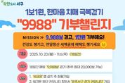 한민일보 서울포커스 박용남 기자 | 광주광역시 서구가 오는 20일부터 11월 6일까지 18일간, 치매 인식 개선과 기부문화 확산을 위한 ‘1보1원, 한마음 치매극복걷기 9988 기부챌린지’를 진행한다. 이번 챌린지는 치매상담콜센터 홍보와 함께 주민 참여를 통해 치매 극복에 대한 지역사회의 관심을 높이기 위해 기획됐다. 치매상담콜센터는 연중무휴로 전문상담사가 맞춤형 상담을 제공하는 서비스로 ‘18세 기억을 99세까지, 99세까지 팔팔(88)하게’라는 의미를 담고 있다. 참가자는 ‘워크온(Walk On)’ 앱을 활용해 하루 평균 9988보를 달성할 경우 ‘1만원 기부권’을 받을 수 있으며 챌린지 종료 후 만족도 조사와 기부 동의 절차를 완료하면 기부권이 서구 관내 취약계층 치매환자 가구에 전달된다. 서구는 총 300명의 챌린지 달성자를 목표로 하며 누적 기부금 300만 원은 치매환자 30가구에 각 10만 원씩 전달할 예정이다. ‘9988 챌린지’ 참여가 어려운 주민은 하루 동안 1만보를 걷고 1만 원을 기부하는 ‘1보1원 순수기부’에 참여할 수 있다. 김이강 서구청장은 “치매는