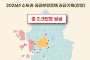한민일보 서울포커스 임철현 기자 | 국토교통부와 4개 공공기관은 ’26년 수도권 공공택지에서 총 2.9만호 규모의 공공분양주택을 순차적으로 공급할 계획이라고 밝혔다. 이번 공급 물량은 새정부 「주택공급 확대방안」(9·7대책)에서 발표한 수치(2.7만호) 대비 약 2천호 증가한 규모로, 판교(2.9만호)급 신도시를 하나 새로 조성한 것에 준하는 수준이다. 특히, 4개 공공기관의 올해 분양 물량(2.2만호)보다 32.2% 증가했고, 최근 5년간 평균 수도권 분양 물량(1.2만호)의 약 2.3배 수준으로, 공공 부문의 착공 확대 노력의 성과가 가시화되며, 공급 확대 국면으로 전환되고 있음을 보여준다. 내년에 분양될 단지들을 살펴보면, 지역별로는 △서울 1.3천호, △인천 3.6천호, △경기 23.8천호로 분포되어 있고, 주요 지구별로는 △3기 신도시 7.5천호, △2기 신도시 7.9천호, △기타 중소택지 13.2천호의 공공주택이 분양될 예정이다. 3기 신도시에서는 △고양창릉(3,881호), △남양주왕숙(1,868호), △인천계양(1,290호), 2기 신도시에서는 △광교(600호), △평택고덕(5,134