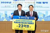 한민일보 서울포커스 임철현 기자 | 광주은행은 22일 광주광역시청에서 강기정 광주광역시장, 정일선 광주은행장, 염규송 광주신용보증재단 이사장 및 관계자가 참석한 가운데 ‘2026년 소상공인 특례보증 대출 지원사업 협약’을 체결했다고 밝혔다. 이번 협약을 통해 광주은행은 고금리와 경기침체 등으로 어려움을 겪는 광주지역 소상공인(골목상권)에 대한 금융지원 확대를 위해 23억 원을 특별출연했다. 이를 재원으로 광주신용보증재단은 총 466억 원 규모의 특례보증을 지원하며, 광주광역시는 1년간 3~4%의 이차보전을 지원할 계획이다. 소상공인 특례보증 융자 지원 대상은 유흥·도박·사행성 업종 등 일부 업종을 제외한 광주지역 소재 소기업·소상공인·자영업자 전 업종이며, 업체당 최대 5천만 원까지 지원받을 수 있다. 대출 기간은 7년 이내다. 보증 신청은 오는 26일부터 광주은행 ‘Wa뱅크’ 앱과 광주신용보증재단 ‘보증드림’ 앱을 통한 비대면 방식으로 가능하다. 비대면 신청이 어려운 경우에는 광주신용보증재단 영업점을 방문해 대면 신청도 가능하다. 한편 광주은행은 2020년부터 현재까지 광주광역시 소상공인(골목상권