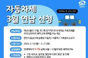 한민일보 서울포커스 황준형 기자 | 천안시 동남구는 내달 16~ 31일 자동차세 연납 신청을 받는다고 27일 밝혔다. 매월 6월과 12월 정기적으로 부과되는 자동차세를 미리 납부하면 세금 할인 혜택을 받을 수 있다. 3월에 연납 신청할 경우 4~ 12월에 대한 세액의 5%(연세액의 약 3.7%)를 공제받을 수 있다. 신청 대상자는 천안시 동남구에 등록된 모든 차량 소유자로, 기간 내에 신청해야 할인 혜택을 받을 수 있다. 신청은 구청 세무과·읍면동 행정복지센터 방문, 전화, 위택스를 통해서 가능하다. 납부는 전국 모든 은행 CD/ATM, 위택스·인터넷지로, 가상계좌 이체 중 편리한 방법으로 하면 된다. 한익희 세무과장은 “지난달 연납 신청 기회를 놓친 시민분들께서는 3월 신청 기간을 적극 활용해 세금 절감 혜택을 누리시길 바란다”고 말했다.