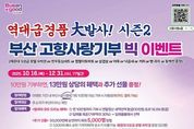 한민일보 서울포커스 임광현 기자 | 부산시는 오늘(16일)부터 12월 31일까지 77일간, 고향사랑기부제 참여 확산을 위해 '역대급 경품 대발사 시즌2! 부산 고향사랑기부제 연말 빅 이벤트'를 개최한다고 밝혔다. 지난 5월 진행된 ‘역대급 경품 대발사’ 이벤트는 해운대 5성급 호텔 숙박권을 포함한 푸짐한 경품으로 많은 시민들의 뜨거운 관심과 참여 속에 성황리에 마무리됐다. 이번 시즌2 이벤트는 그 성원에 힘입어 더욱 풍성한 혜택과 경품으로 시민들을 다시 한번 찾아온다. 특히, 올해 10월 17일부터 부산에서 개최되는 제106회 전국체육대회와 연계해 이번 이벤트를 가을부터 연말까지 이어가며, 시민들에게 다채로운 혜택과 즐거움을 제공할 계획이다. 이와 함께 시는 전국체전 기간(10.17.~10.23.)과 전국장애인체전 기간(10.31.~11.5.)에 ‘고향사랑기부제 홍보 공간(부스)’을 운영해 현장 방문객들에게 기부제 취지와 참여 방법을 적극 알릴 예정이다. 또한 이벤트 기간 중 시청에 1회 10만 원 이상 기부한 기부자에게 기본혜택 2가지와 함께 특별한 추가 경품 4가지를 증정한다. &n