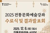 한민일보 서울포커스 박용남 기자 | 광주문화재단 전통문화관은 오는 12월 6일 오후 2시 전통문화관에서 광주광역시 무형유산 보유자와 수강생이 함께하는 ‘2025 전통문화예술강좌 수료식 및 결과발표회’를 개최한다. 이번 행사는 상·하반기 총 26개 강좌에서 강좌별 15회차 중 70% 이상 출석한 수강생에게 수료증을 수여하고, 무형유산 기·예능 보유자 및 전문강사에게 직접 배운 기량을 선보이기 위해 마련됐다. 수료식은 상·하반기 수강생 수료증 전달식에 이어 1부 기능분야(탱화, 민화, 전통음식) 발표회, 2부 예능분야(판소리, 판소리고법, 가야금병창) 발표회 순으로 진행된다. 2025년 전통문화예술강좌 수강생은 총 269명이다. 상반기 강좌에서는 수강생 140명 중 122명, 하반기 강좌에서는 수강생 129명 중 118명이 수료증을 받을 예정이다. 1부 기능분야 발표회에서는 광주광역시 남도의례음식장 최영자 보유자 강좌의 조아란 수강생, 이애섭 보유자 강좌의 김은수 수강생, 민경숙 보유자 강좌의 안건상 수강생이 전통음식 대표 작품을 소개한다. 또한 광주광역시 탱화장 송광무 보유자가 진행한 탱화 강좌의 김