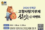 한민일보 서울포커스 진광성 기자 | 인제군은 2026년 설 명절을 맞아 고향사랑기부제 참여 확산을 위한 특별 이벤트를 오는 1월 26일부터 2월 20일까지 진행한다. 이번 이벤트는 인제군에 10만 원 이상 기부하고, 고향사랑e음 또는 위기브를 통해, 주문한 답례품 후기를 작성하면 자동으로 응모되는 방식으로 운영된다. 응모자 가운데 추첨을 통해 30명을 선정해 강원한우 사골곰탕 선물세트를 제공하며, 당첨자는 2월 23일 이후 개별 문자로 안내할 예정이다. 기부는 온라인 플랫폼인 고향사랑e음과 위기브, 또는 전국 농협은행·농축협 지점을 통해 가능하다. 군은 이번 이벤트를 통해 고향사랑기부제에 대한 인지도를 높이고, 명절을 계기로 기부 참여를 확대해 지역경제 활성화로 이어간다는 계획이다. 김장웅 인제군 지역발전과장은 “설 명절을 맞아 고향을 응원하는 마음이 자연스럽게 기부로 이어질 수 있도록 이번 이벤트를 마련했다.”며 “고향 사랑기부제가 지역에 실질적인 도움이 되는 제도인 만큼 많은 관심과 참여를 바란다.”고 말했다. 한편, 고향사랑기부제는 개인이 주소지 외 지방자치단체에 기부