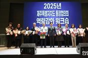 한민일보 서울포커스 임경복 기자 | 지역 현장의 최일선에서 주민과 행정을 연결하는 핵심 역할을 수행하는 제주특별자치도 통장협의회가 6일 지역 발전과 상호 교류를 확대하기 위한 소통의 자리를 마련했다. 이번 출범식은 올해 8월 1일 출범한 제주도 통장협의회의 첫 공식 행사다. 제주특별자치도는 이날 오전 제주국제컨벤션센터에서 도내 31개 동 지역 통장 600여 명이 참석한 가운데 ‘2025년 제주특별자치도 통장협의회 역량강화 워크숍’이 개최됐다고 밝혔다. 이번 워크숍에서는 올해 지역발전을 위해 기여한 우수 통장 31명이 장관, 도지사, 도의회의장 표창 및 도교육감 감사패를 받았다. 특히 김도연 회장은 올해 도 단위 통장협의회 출범을 이끈 공로를 인정받아 행정안전부장관 표창을 수상했다. 이후 특강에서는 국제웃음치료협회 한광일 회장이 ‘즐거운 소통 리더십’을 주제로 통장의 역할과 임무를 유쾌하게 풀어내며 참석자들의 큰 호응을 얻었다. 김도연 회장은 인사말을 통해 “2025년 도 통장협의회가 결성된 만큼 앞으로 도내 통장들이 하나로 연대해 주민과 함께 도정 정책 실행에 적극 동참하겠