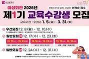 한민일보 서울포커스 임광현 기자 | 부산시 여성문화회관은 오는 내일(8일)부터 '2026년 제1기 문화교실' 수강생을 모집한다고 밝혔다. '여성문화회관 문화교실'은 우수한 강사진을 토대로 시민의 다양한 문화 욕구에 부합하는 배움의 장을 제공하는 평생교육 프로그램이다. 시민들에게 전문적인 능력개발과 삶의 질 향상을 위한 폭넓은 기회를 제공하고자 시 여성문화회관이 운영하고 있다. 2026년 제1기 문화교실은 내년 1월 2일부터 3월 28일까지 11주간 진행되며, 전통·어학·요리·예술·현대생활 5개 분야 97개 강좌에서 1,913명의 수강생을 모집할 예정이다. 이번 교육 과정에는 전통 분야를 비롯한 다양한 문화예술 강좌와 취·창업 등에 도움이 되는 자격증 강좌, 직장인을 위한 야간·주말 강좌가 운영될 예정이다. ▲문화예술 강좌로는 가야금, 기타, 꽃꽂이 등이 있으며 ▲자격증 강좌로는 제빵(베이킹), 컴퓨터 자격증 과정 등이 있다. 또한, ▲야간에 운영되는 필라테스․요가, 커피 바리스타 과정, 사진예술 등의 강좌 ▲주말 과정인 전통주·꽃차, 여행영어 과정 등도 만나볼 수 있다. 1