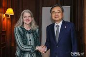 한민일보 서울포커스 임경복 기자 | 주요 7개국 협의체(G7) 외교장관회의 참석차 프랑스를 방문 중인 조현 외교부 장관은 3월 26일 오후(현지시간) 미측 수석대표로 참석중인 앨리슨 후커(Allison Hooker) 美 국무부 정무차관을 접견하고, 최근 중동 및 지역 정세, 한미 정상회담 공동성명(Joint Fact Sheet, JFS) 이행 등 한미 간 현안 등에 대해 의견을 교환했다. 조 장관은 호르무즈 해협 상황에 대해 우려를 표명하고, 동 해협 내 우리 선박을 포함, 모든 선박에 대한 항행 안전 보장과 글로벌 에너지 및 물류 공급망 정상화를 위한 긴장 완화 조치가 무엇보다 시급하다고 강조하면서 이를 위해 긴밀히 소통해나가자고 했다. 후커 정무차관은 이에 공감하고, 우리 정부가 '호르무즈 해협 관련 공동성명'동참 등을 통해 안전하고 자유로운 통항을 확보하기 위한 국제사회의 노력에 기여하고 있음을 평가했다. 조 장관과 후커 차관은 최근 대미투자특별법 국회 통과 등 투자합의 이행의 진전을 평가하고, 한미 JFS 안보 분야 이행을 위한 후속 실무 협의도 조속히 개시해 나가자는데 의견을 같이했다. 양측은 여러
