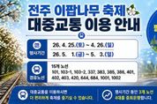 한민일보 서울포커스 김용택 기자 | 주말을 맞아 이팝나무가 만개한 전주시 팔복동 철길을 찾는 시민들을 위해 전주시내버스가 더 자주 다닌다. 전주시는 오는 25일~26일, 5월 1일~3일 등 총 5일간 팔복예술공장 일대에서 펼쳐지는 ‘2026 전주 이팝나무 축제’에 맞춰 방문객 집중 시기에 시내버스 운행을 조정하는 등 교통수요 중심의 운영 대책을 추진한다고 23일 밝혔다. 시는 올해 4월 벚꽃 개화 시기에 맞춰 만경강변 일대에 특별노선을 운영하는 등 계절별 관광수요에 대응한 교통 지원을 추진했으며, 이러한 운영 경험을 바탕으로 이번 이팝나무 축제 기간에도 교통 운영을 이어갈 계획이다. 이번 축제는 개화 시기에 맞춰 연속 운영이 아닌 주말·공휴일에 집중 운영 방식으로 진행되는 것이 특징으로, 시는 방문객이 몰리는 시기 주말·공휴일 버스 운행을 조정해 5개 노선에 버스 7대를 추가 하는 등 교통 지원을 강화키로 했다. 축제장을 경유하는 전주시내버스 노선은 △101번 △103-1번 △103-2번 △337번 △383번 △385번 △401번 △402번 △403번 △420번 △644번 △684번 △1001번